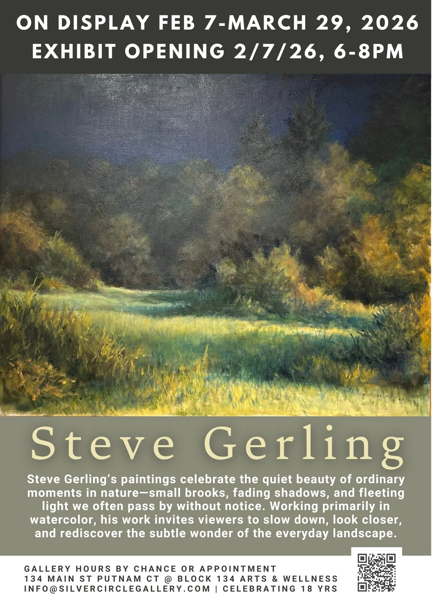 His paintings invite viewers to pause and recognize the subtle beauty woven into familiar landscapes: a small brook glimpsed from a roadside bridge, the color of shadows dissolving into the woods at dusk. These are not grand gestures, but intimate observations, rendered with sensitivity and care. For Gerling, the enjoyment of the everyday is richer and more meaningful than the heroic, and if his work encourages someone to notice something they’ve overlooked for years, he considers it a success.